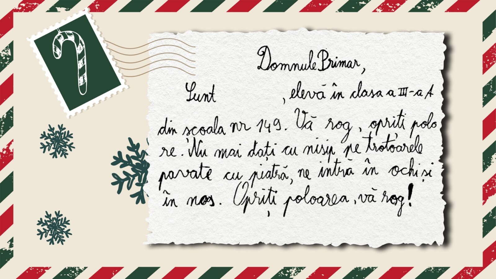 “Odată cu venirea Sărbătorilor, vin și zilele irespirabile în oraș. Anul trecut, cea mai poluată zi a fost 24 decembrie, după cum arată senzorii #aerlive. Bucureștiul este în top 5 cele mai poluate capitale din Europa, depășind aproape zilnic de 3 ori limita admisă, mai ales pe lângă școli sau grădinițe. Iar copiii au de 10 ori mai multe șanse decât un adult să fie afectați medical de poluare. Scrisorile lor au devenit o campanie de susținere a proiectului care poate rezolva una dintre marile surse de poluare din capitală și nu numai, proiectul având ca scop interzicerea staționării prelungite cu motorul pornit”, se arată într-un comunicat de presa transmis de Centrul pentru Politici Durabile Ecopolis.