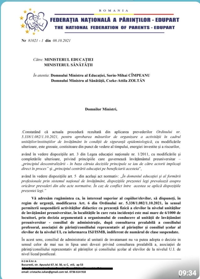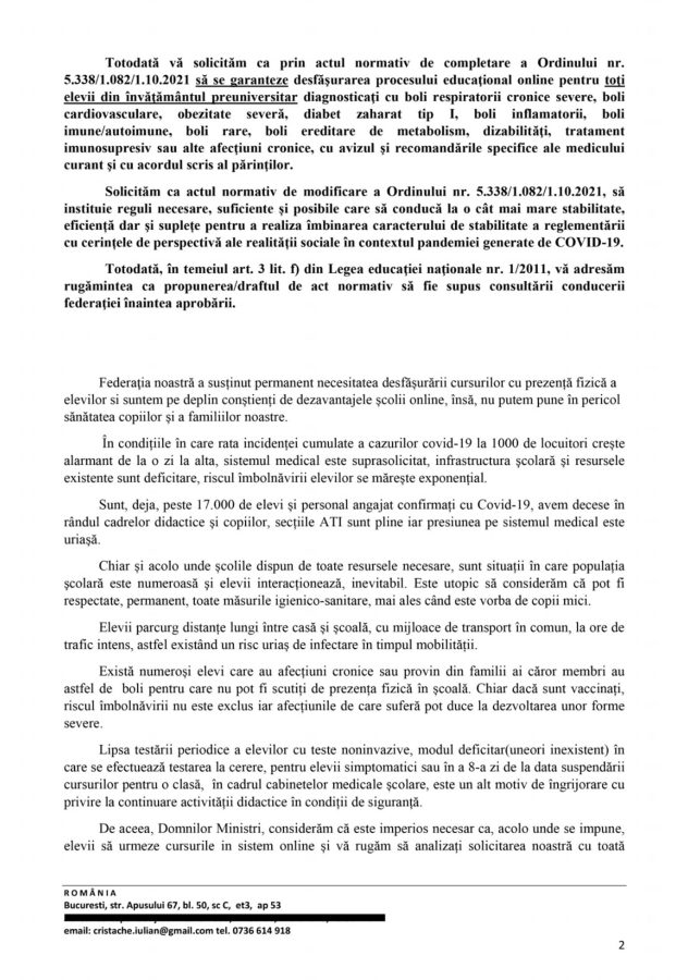 Vă adresăm rugămintea ca, în interesul superior al copiilor/elevilor, să dispuneți, în regim de urgență, modificarea Art. 6 din Ordinului nr. 5.338/1.082/1.10.2021, în sensul permiterii suspendării activităților didactice cu prezență fizică a elevilor la nivelul unităților de învățământ preuniversitar, în localitățile în care rata incidenței este mai mare de 6/1000 de locuitori, prin decizia argumentată a organismului de conducere al unităţii de învăţământ preuniversitar – consiliul de administrație, după consultarea prealabilă a consiliului profesoral, asociaţiei de părinţi/consiliului reprezentativ al părinților și consiliul şcolar al elevilor de la nivelul UI, cu informarea ISJ/ISMB, indiferent de numărul de clase suspendate