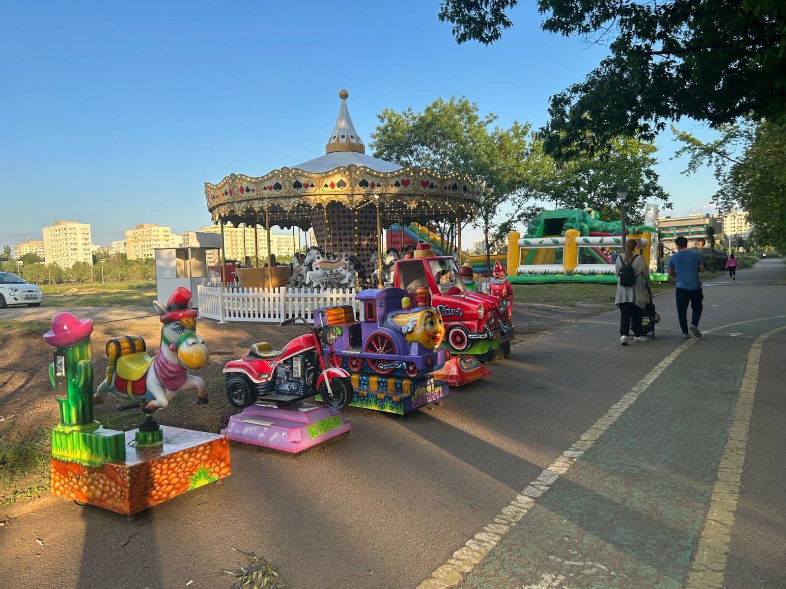 Cei mici, curioşi din fire, se opreau din mers, uitându-se cu jind la puţinele atracţii aduse pe terenul retrocedat: un carusel, un trenuleţ, două instalații gonflabile, bungee jumping şi câteva maşinuţe.