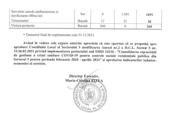 ”Pentru perioada octombrie 2020 – decembrie 2021, în cadrul proiectului se solicită finanțarea achiziționării de echipamente de protecție, reespectiv: măști, mănuși, combinezoane, viziere de protecție, botoși, termometre, lămpi UV, produse biocide și dispozitive igienico-sanitare în valoare de 621.223,25 lei.