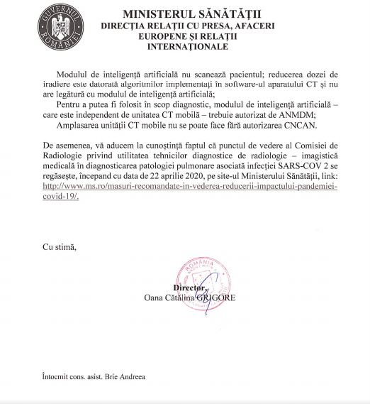 Doar că Ministerul Sănătății a publicat în 22 aprilie recomandările privind practica radiologică în relație cu infecția SARS-CoV2 prin care spune în mod clar faptul că analiza CT nu este considerată metodă de dignostic, ci doar de confirmare și verificare a stadiului bolii: