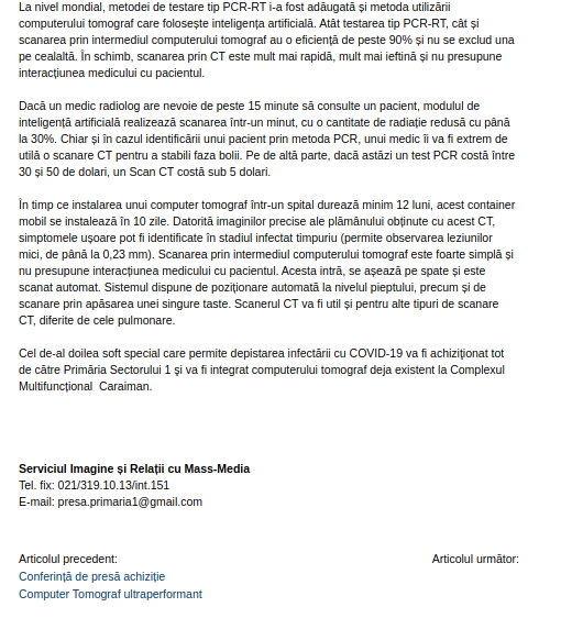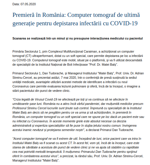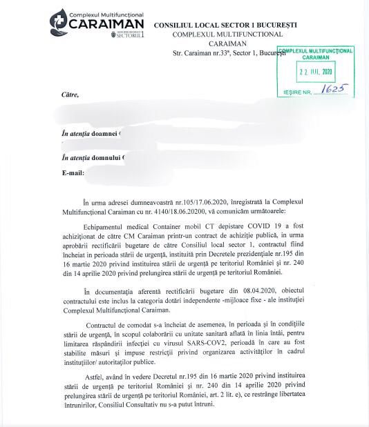 În luna aprilie, în plină stare de urgență, Complexul Multifuncțional Caraiman din București cumpăra un computer tomograf. Complexul funcționează în administrarea Primăriei Sector 1 și oferă servicii medicale gratuite locuitorilor din sector. Ca achiziția să fie posibilă fără licitație, caietul de sarcini a fost adaptat vremurilor. Aparatul s-a transformat în “Container mobil CT de depistare COVID-19”, iar contractul a fost atribuit unei firme cu care complexul avea o relație mai veche. Peste 4,8 milioane de lei din banii cetățenilor din Sectorul 1 s-au dus în contul firmei SC Medical Gaz Plus.