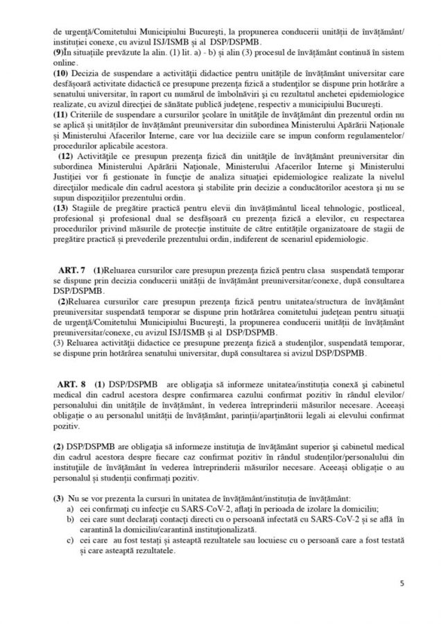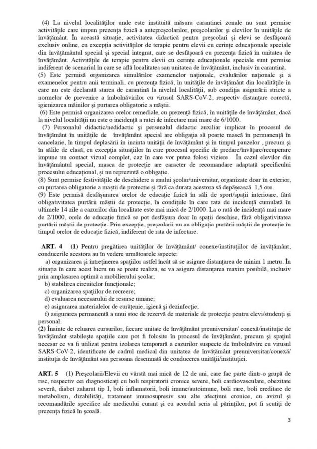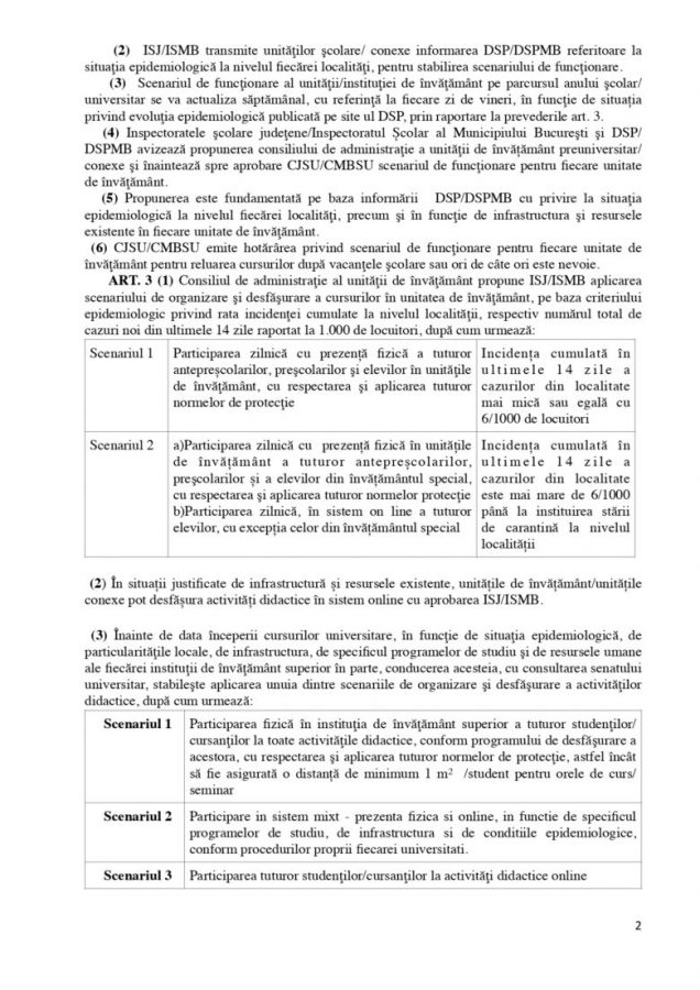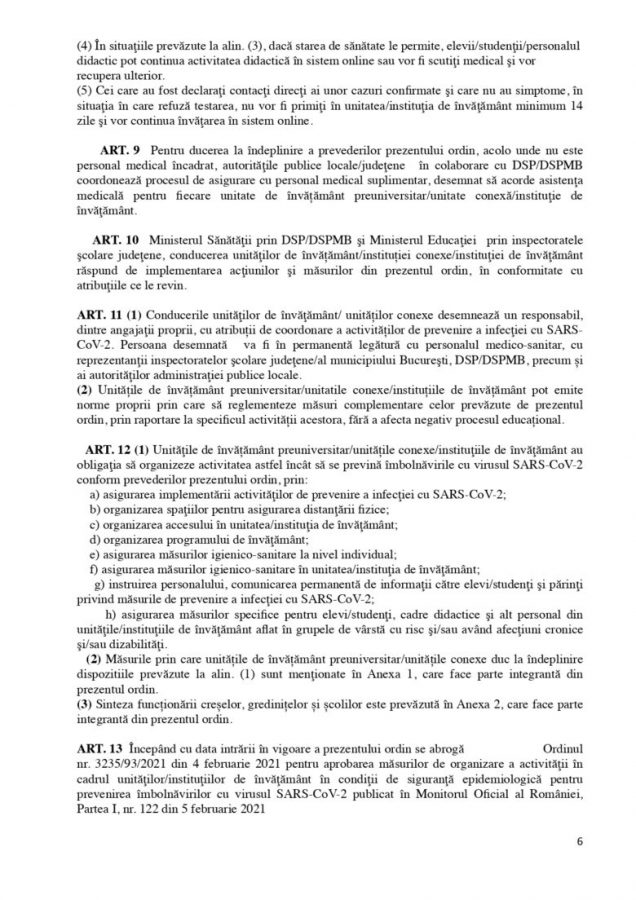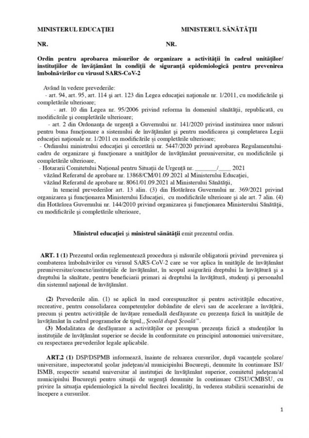 Ministerul Educației a făcut publice regulile pentru deschiderea și funcționarea școlilor. Conform documentului, masca va fi obligatorie pentru tot personalul școlii și pentru elevi în interiorul școlii, nu și în curte. Pe lângă stabilirea unor reguli generale privind distanțarea fizică, igiena și organizarea cursurilor, documentul stabilește și care sunt scenariile de funcționare în funcție de numărul de cazuri raportat la mia de locuitori. Ordinul comun al celor două ministere mai precizează și că doar elevii nevaccinați vor fi testați atunci când apare un caz pozitiv într-o clasă.