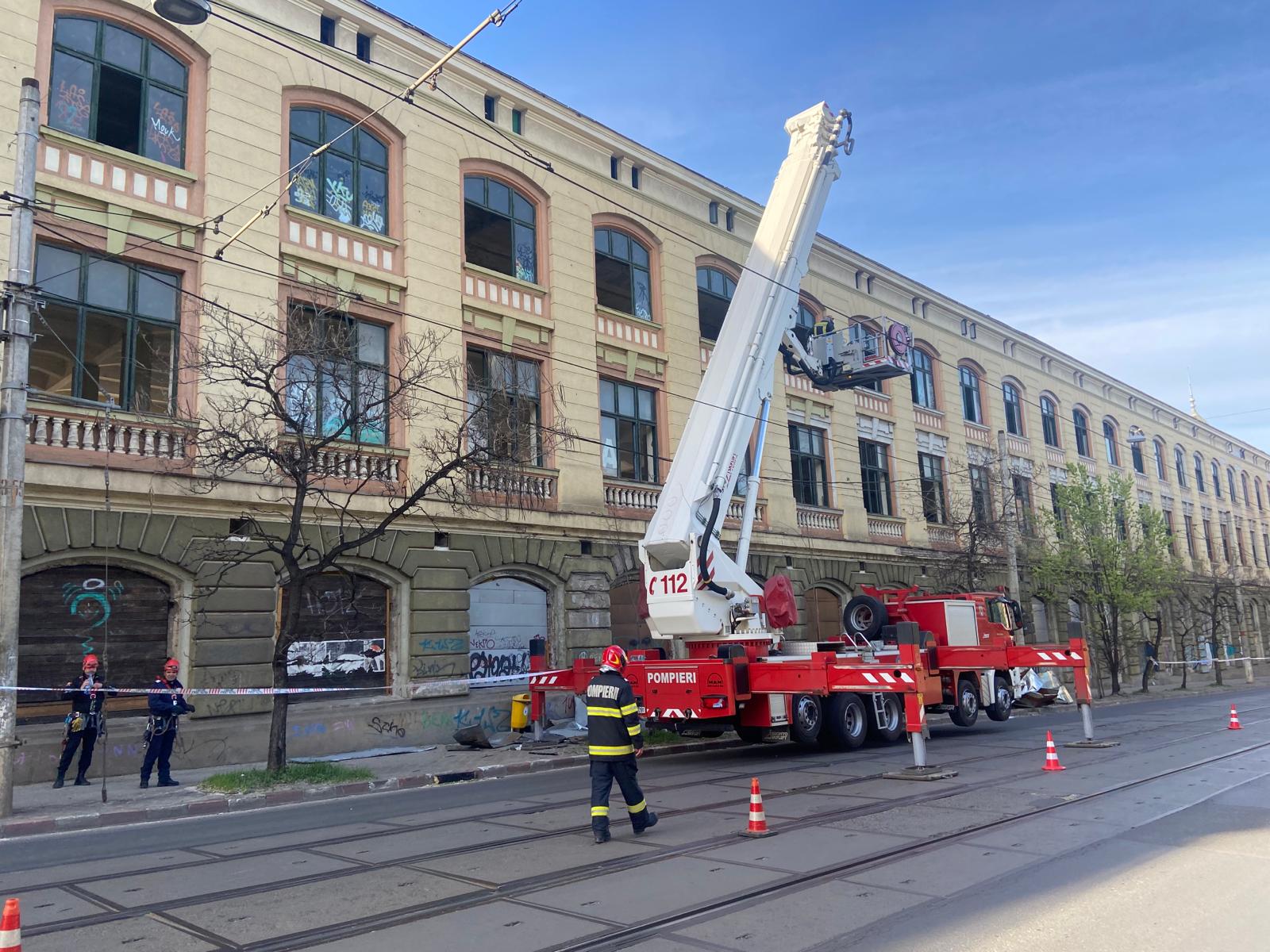 Din același motiv, un alt echipaj a intervenit simultan pentru a demonta bucățile de țiglă de pe acoperișul unei clădiri abandonate, la doar câțiva metri de fabrică.
