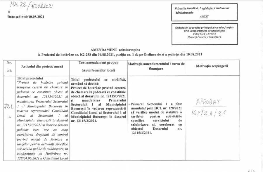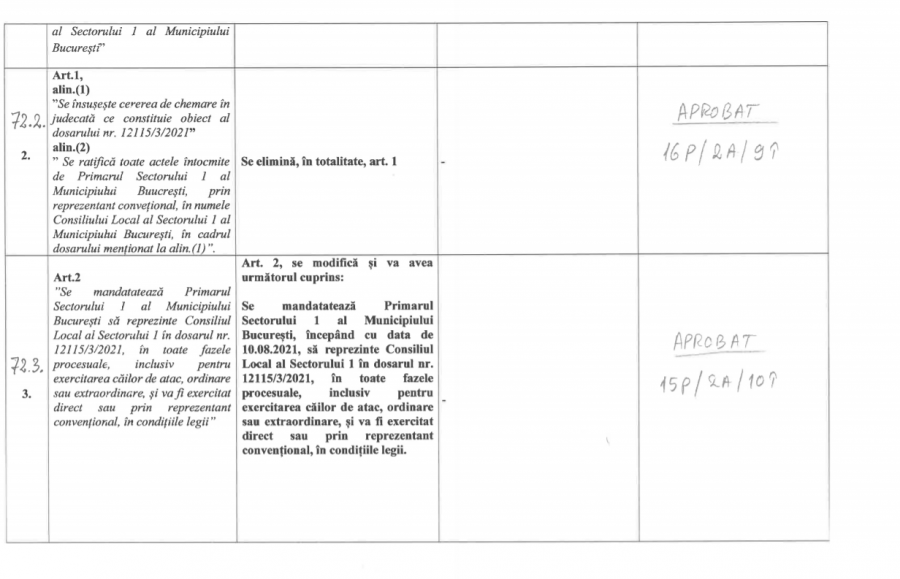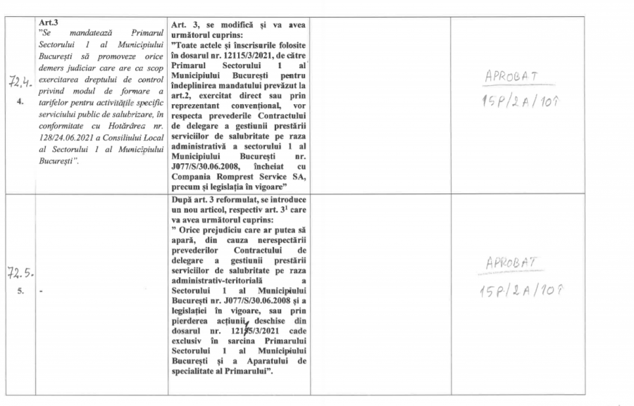 Proiectul inițial de Hotărâre de Consiliu Local prevedea ca primarul să-și însușească cererea de chemare în judecată a Romprest din dosarul 12115/3/2021, în care Primăria solicita companiei de salubritate să comunice cheltuielile făcute cu prestarea serviciului.