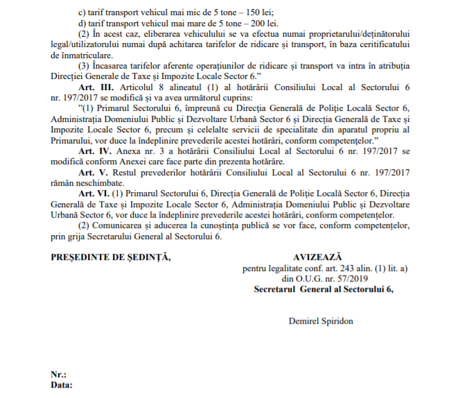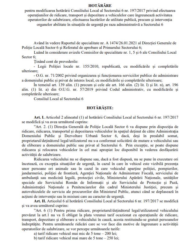 În acest moment, pe lângă Primăria Sectorului 6, doar Primăria Generală și Primăria Sectorului 3 au un regulament aprobat pentru ridicarea mașinilor parcate ilegal.