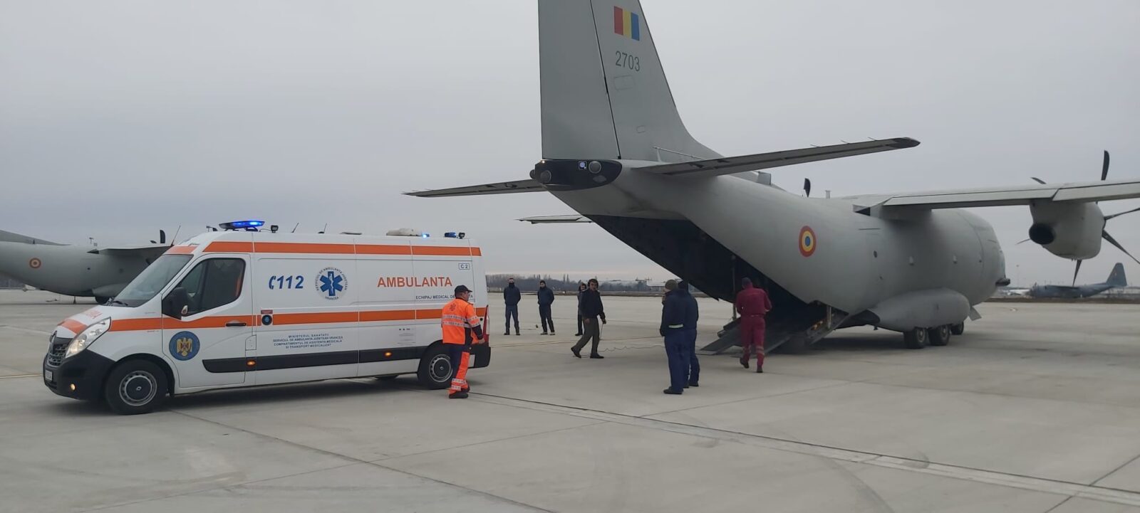 Un pacient ars pe mai mult de jumătate din suprafața corpului a fost transportat de la București la Bruxelles pe 2 ianuarie, în prima misiune umanitară aeriană a anului, din aripa militară a Aeroportului Internațional Henri Coandă.