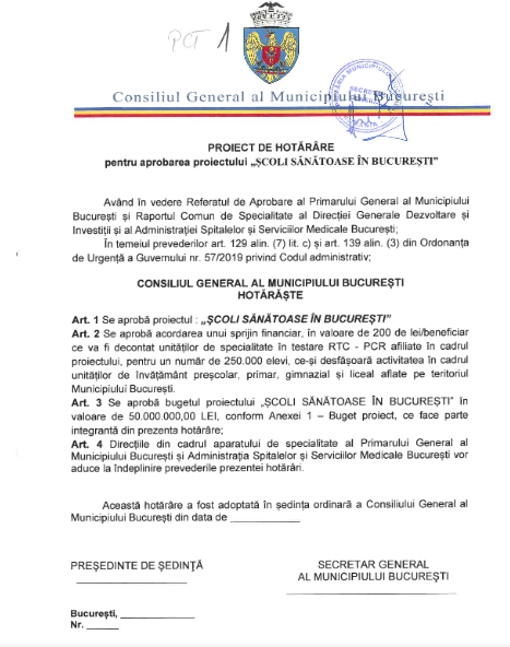 Primarul Capitalei, Gabriela Firea, a inițiat un proiect de hotărâre prin care acordă 50 milioane lei pentru teste Covid19. Testele ar urma să fie făcute pentru 250.000 de elevi care studiază pe raza municipiului București. Conform hotărârii fiecare beneficiar urmează să primească 200 de lei sub formă de sprijin financiar pentru a deconta cheltuielile aferente testării RTC-PCR. Proiectul se numește „Școli Sănătoase în București” și a fost votat luni și a trecut cu 38 de voturi pentru, 0 împotrivă și 5 abțineri.