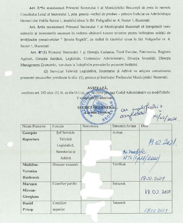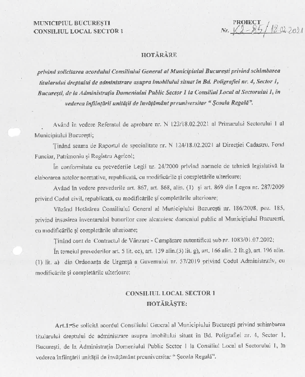 Dacă proiectul trece, primarul Sectorului 1 urmează să preia în numele Consiliului Local, prin proces verbal de predare-primire încheiat cu Administrația Domeniului Public, imobilul situat în Bulevardul Poligrafiei nr. 4. Totodată, acesta este mandatat să întreprindă toate demersurile necesare în vederea obținerii avizelor pentru înființarea unității de învățământ “Școala Regală”.