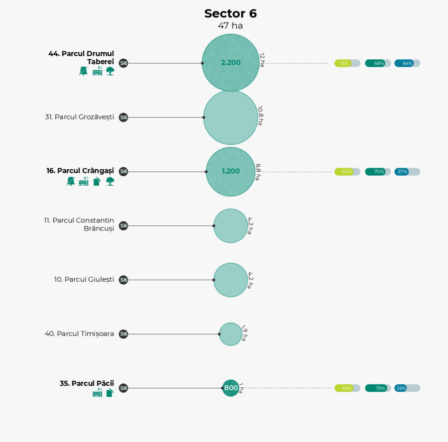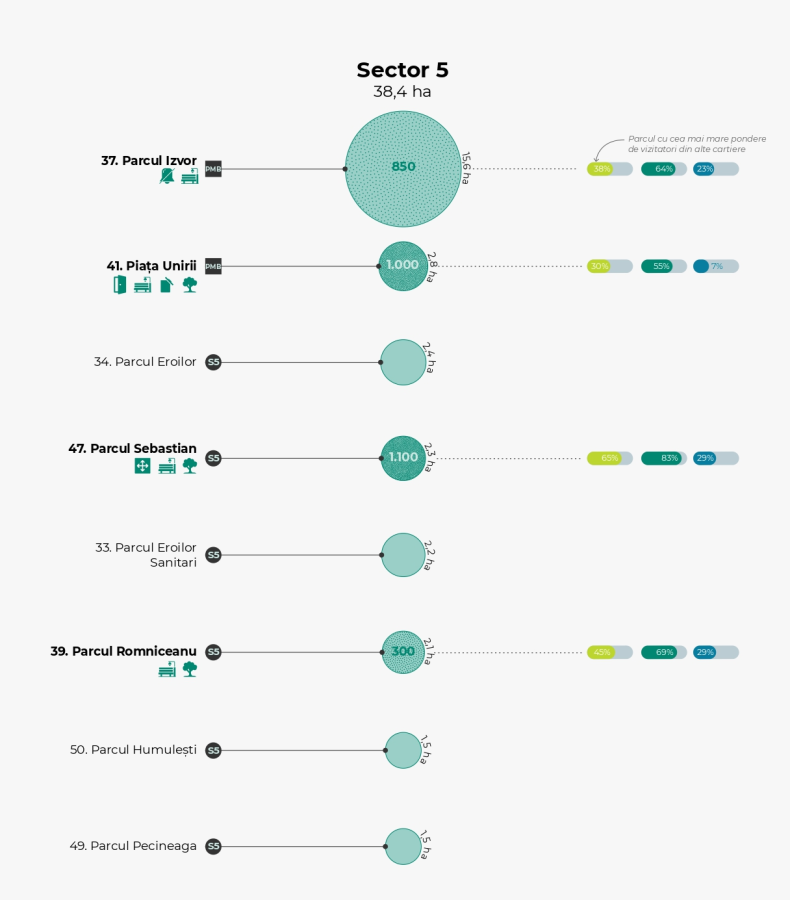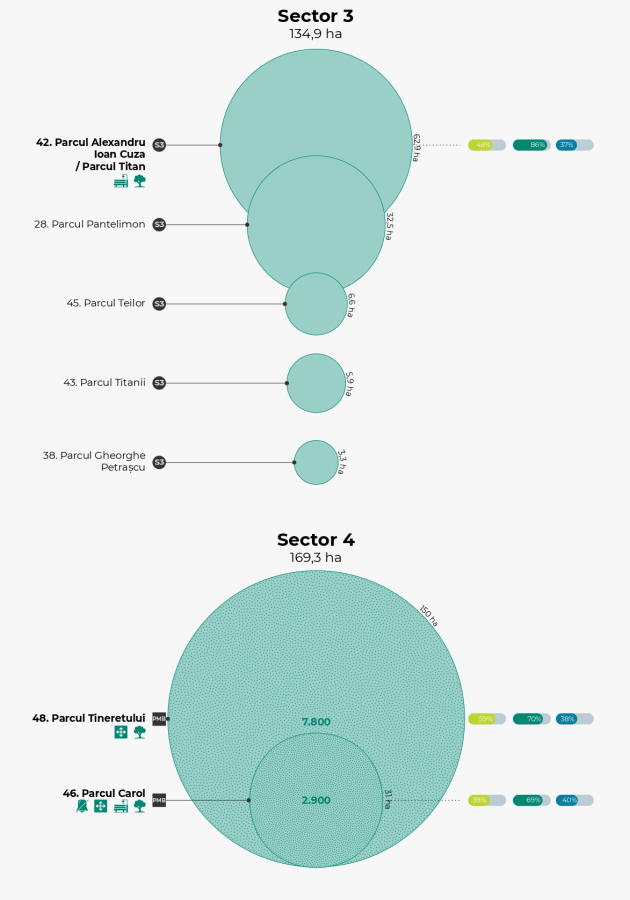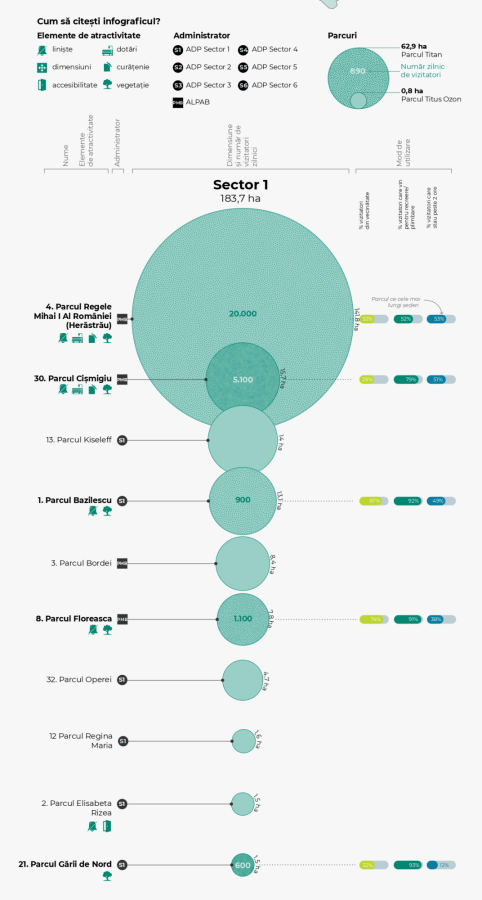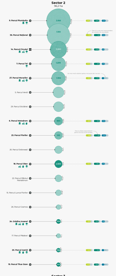 În raport se găsește și o analiză a tuturor parcurilor Capitalei, pe sectoare, din punctul de vedere al suprafeței, administrației, numărul de modul de utilizare – vizitatori din apropiere, care vin pentru recreere, care stau mai mult de 2 ore.