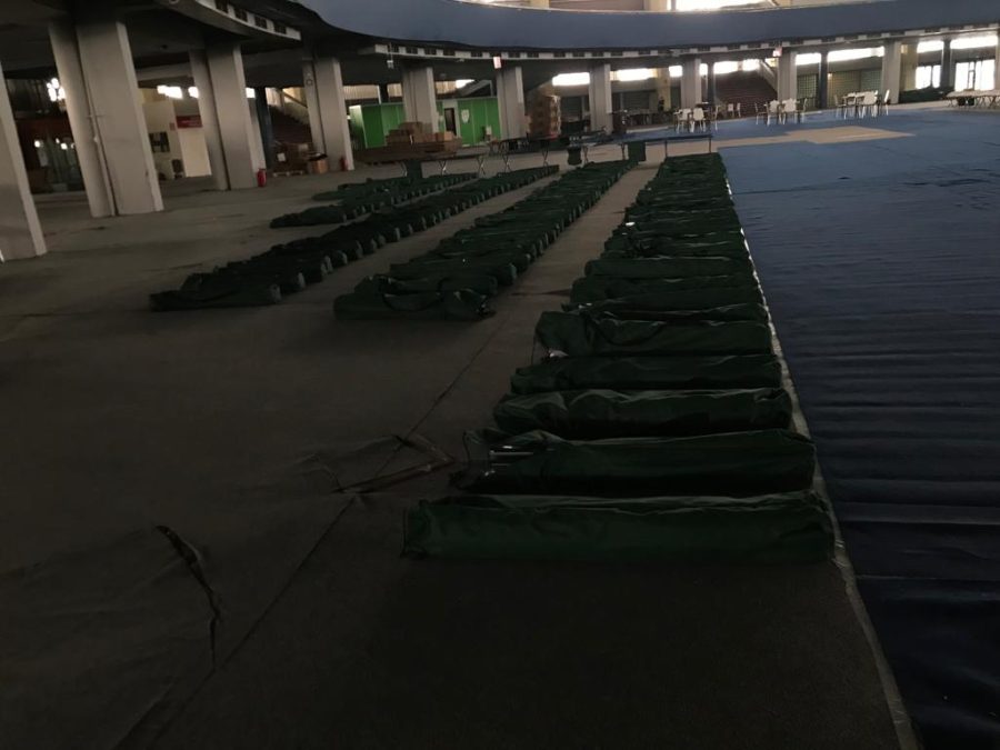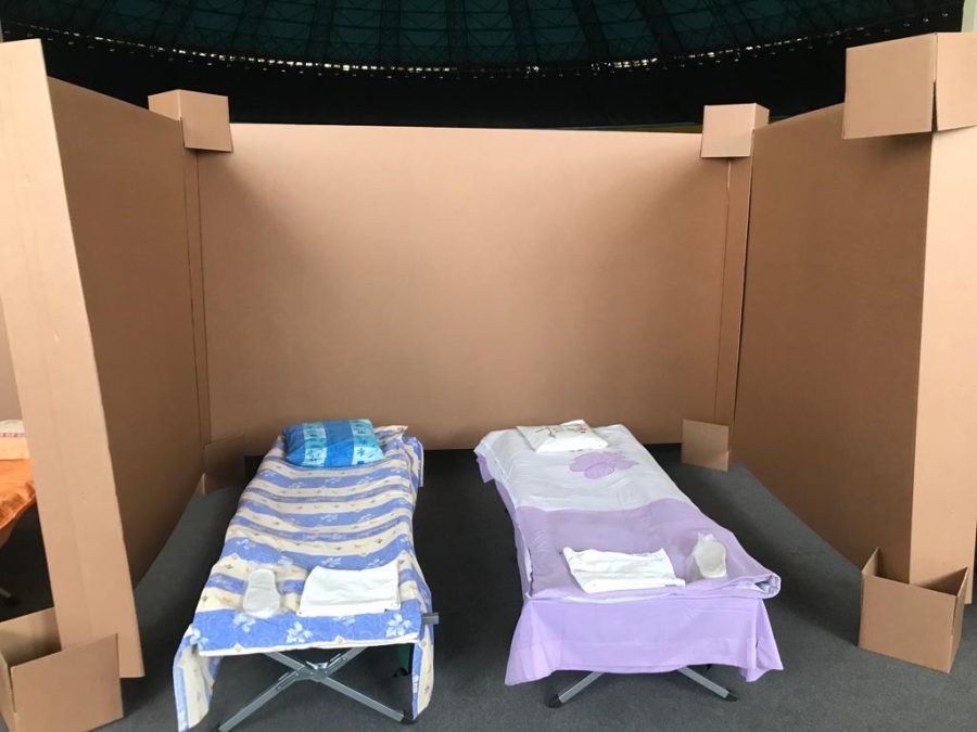 Deși separate de cartoane înalte și groase, care încearcă să creeze impresia de intimitate și de spațiu personal pentru viitorii locuitori, paturile de la etajul al doilea se diferențiază prin culorile lor. Oameni care vin cu plase sau cu saci întregi de donații la Romexpo sau la celelalte două centre de colectare, au adus printre altele și lenjerii de pat, pături, perne.