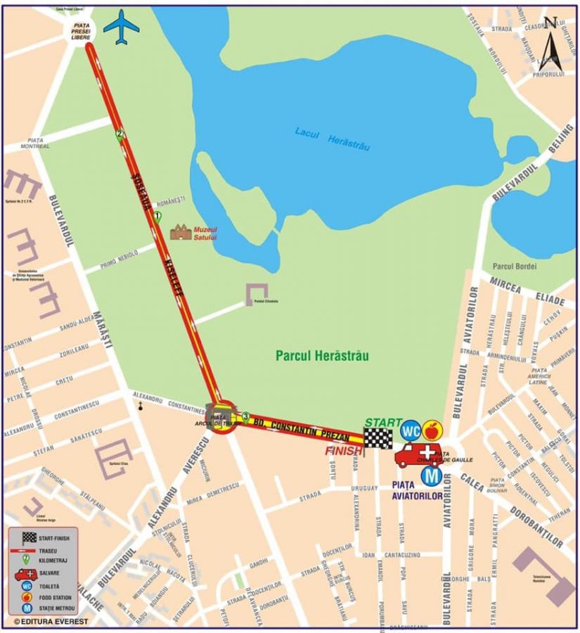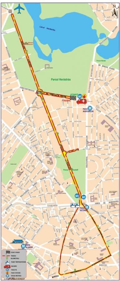 Bd. Constantin Prezan din dreptul str. Alexandrina – Arcul de Triumf – Şos. Kiseleff sensul către Piaţa Presei Libere (locală) – întoarcere pe Şos. Kiseleff (axul central – ambele sensuri, fără a se afecta traficul rutier în Piaţa Presei Libere, cu excepţia benzii I de circulaţie, porţiunea situată între Şos. Kiseleff, mediană şi locală) – Arcul de Triumf (ocolire prin dreapta pe sensul de alergare) – Şos. Kiseleff – Piaţa Victoriei – str. Buzești – str. Berzei – str. Vasile Pârvan – Pod Hașdeu – stânga pe Splaiul Independenței – stânga pe Bd. Unirii zona Fântâni – Piața Alba Iulia – str. Burebista – întoarcere str. Burebista – Bd. Decebal – întoarcere în Piața Hurmuzachi (fără afectarea traficului în intersecție) și retur pe Bd. Decebal – Piața Alba Iulia – Bd. Unirii – dreapta prin fața magazinului H&M (banda V, adiacentă parcului Unirii) – str. Halelor – Splaiul Independenței – dreapta Calea Victoriei – Șos. Kiseleff – str. Ion Mincu – întoarcere pe str. Ion Mincu – Șos. Kiseleff – Arcul de Triumf – Bd. Constantin Prezan – Finish. - În cadrul cursei de 10k – se va alerga pe următorul traseu: