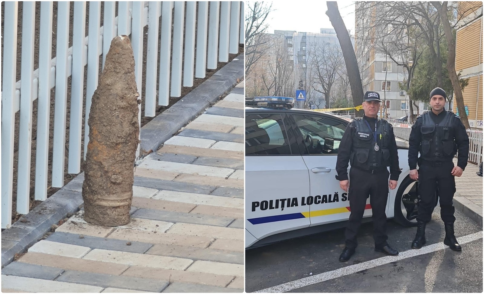 Până la sosirea autorităților cu competențe în domeniu, echipajele Poliției Locale a Sectorului 5 au asigurat perimetrul și… s-au fotografiat alături de proiectil.