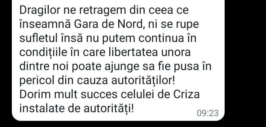 - în niciun moment nu a fost și nu va fi solicitat vreunui voluntar sau O.N.G., care își desfășoară activitatea în Gara de Nord, să se retragă din acest parteneriat viabil dintre autoritățile publice locale, cele private și respectiv voluntari, care funcționează de la debutul acestei situații excepționale. Mai mult decât atât, prin mesajul public pe care l-am transmis prin intermediul mass-media și al canalelor de comunicare instituțională, ne-am manifestat deschiderea pentru a primi alături de noi cât mai mulți voluntari, translatori și alte entități care pot sprijini demersul nostru;