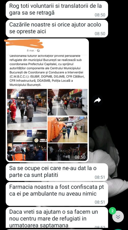 Astăzi am decis să mă retrag din Gara de Nord. Sunt voluntar din data de 2 martie, aproximativ 8-12 ore zilnic..Voluntari minunați, donatori minunați…împreună doar pentru a ajuta până la momentul în care…pe 5 martie autoritățile și-au adus aminte că există și ei iar de duminică, 13 martie au apărut efectiv în teren iar în aceste condiții in care colaborarea societății civile cu autoritățile nu se poate realiza…eu una consider necesar să mă retrag din Gara de Nord, a scris astăzi pe Facebook Ella Mihaela Cristea, voluntar în Gara de Nord.