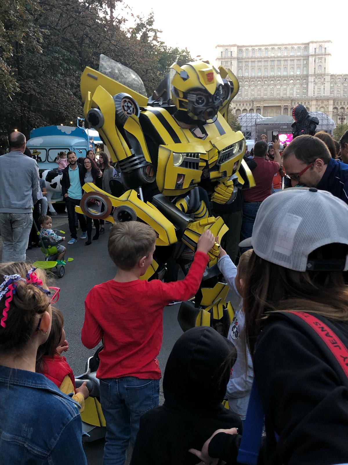 Până și Optimus Prime, șeful autoboților din Transformers a sfâșiat ecranul cinematografului și a venit în viața reală să își facă poze alături de copii. Noroc că robotul avea mai bine de doi metri, că altfel abia îl mai zăreai printre copiii strânși să îl admire. Și nu a venit singur – l-a adus pe Bumblebee, robotul galben care a dansat pe ritmurile Gangnam Style alături de pitici.